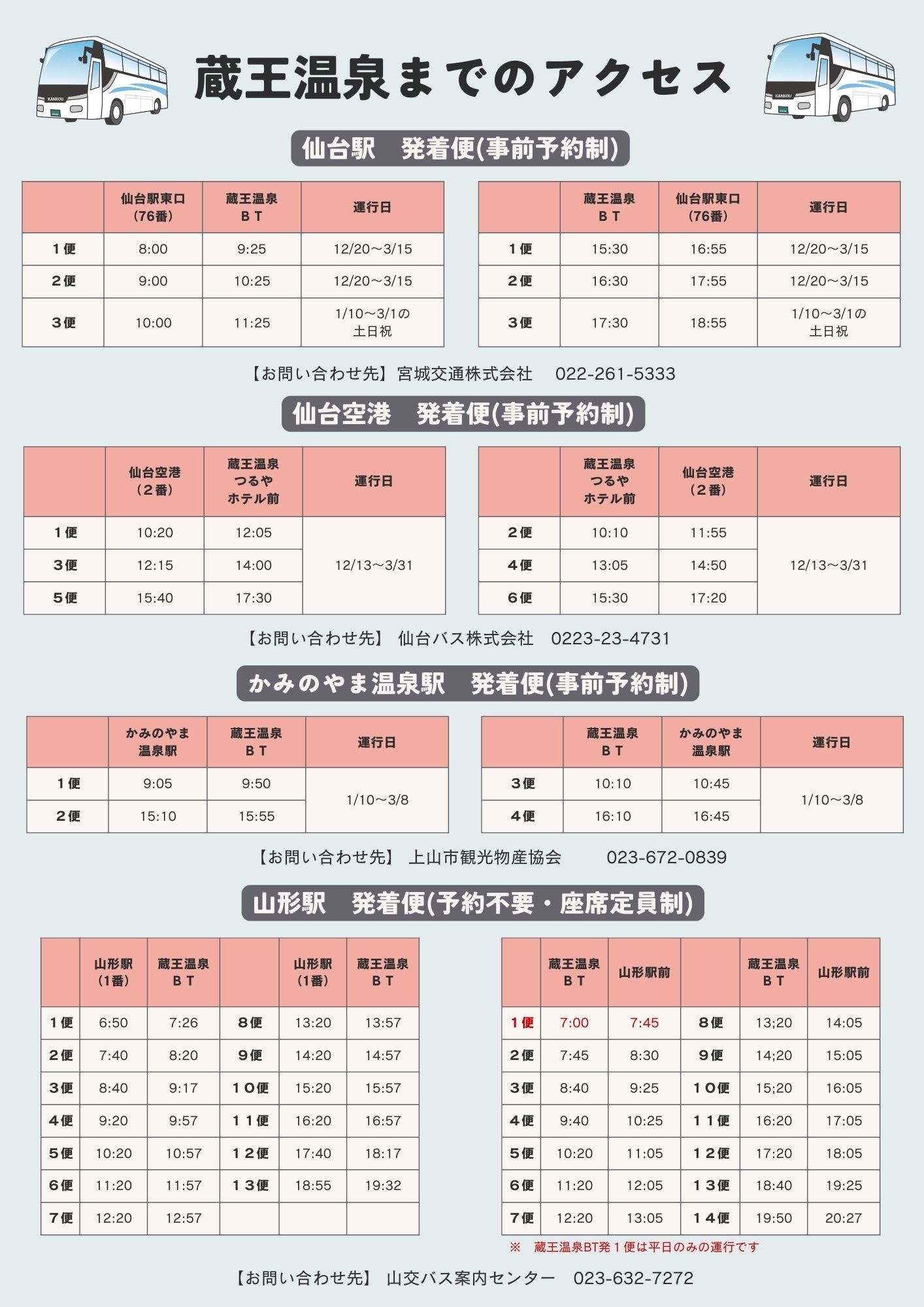 Direct buses also operate from Sendai and Kaminoyama Onsen Station, so we ask for your cooperation in reducing crowding.