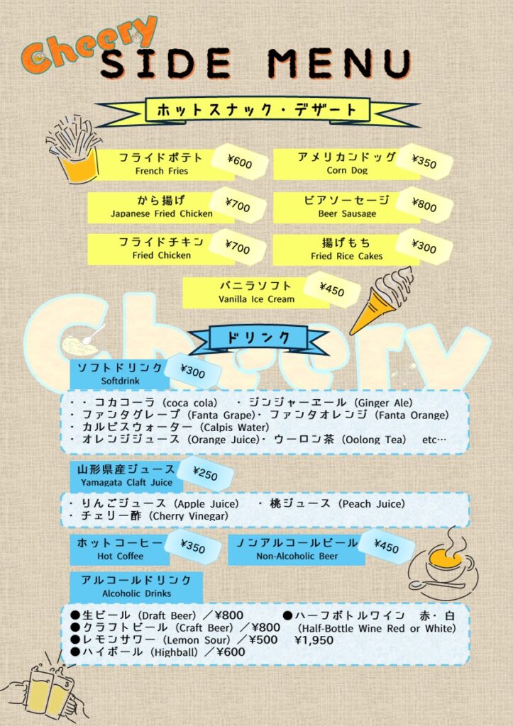 寒い雪山で嬉しい ホットスナックや甘いデザート、山形ならではのドリンク まで、充実のラインナップをご用意しています。